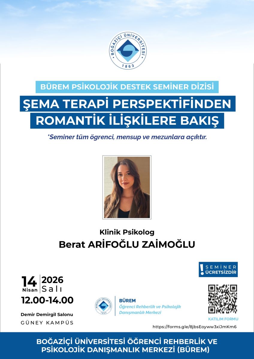 14 Nisan Salı günü, Klinik Psikolog Berat Arifoğlu Zaimoğlu katılımıyla Şema Terapi Perspektifinden Romantik İlişkilere Bakış konulu bir seminer gerçekleştirilecektir.